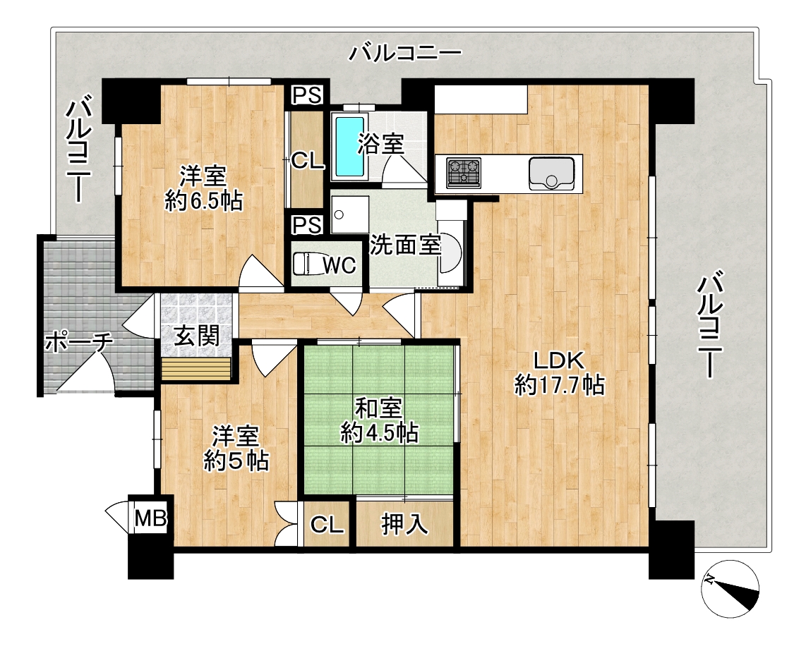| 専有面積 | 73.04㎡(壁芯) | バルコニー面積 | 29.42㎡(南東向き) |